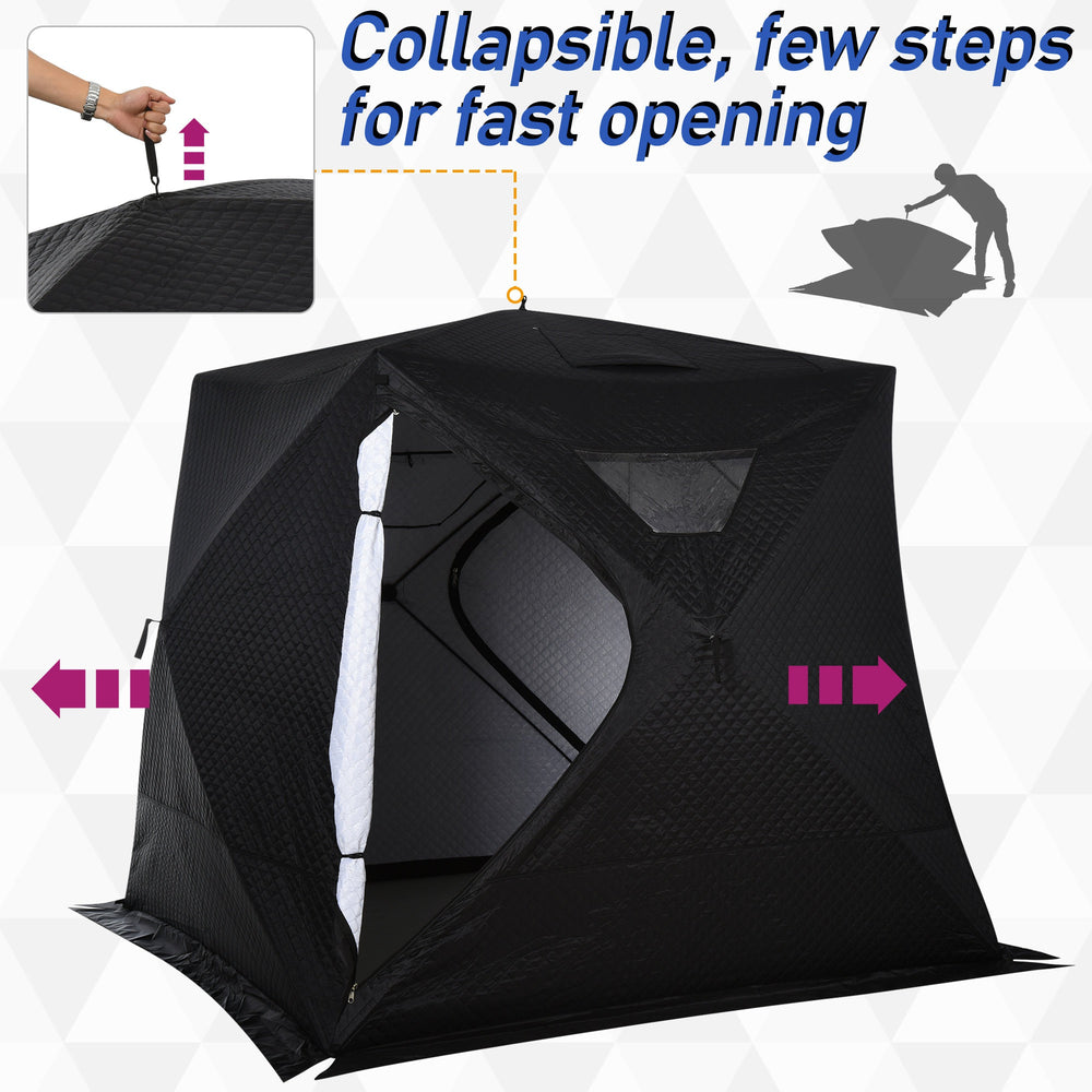 Made of premium waterproof Polyester Compound fabric, this ice fishing tent can keep the cold out even in - 30℃ conditions. Two doors with zippered openings allows for easy access to the tent. Comes with stakes and cord loops to secure this tent to the ground and a carrying bag for easy transportation.